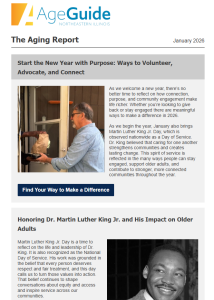 The Aging Report is a monthly publication that gives an overview on aging related topics, updates on AgeGuide initiatives and advocacy, special events and more! Each month highlights a different topic and funded partner of AgeGuide.