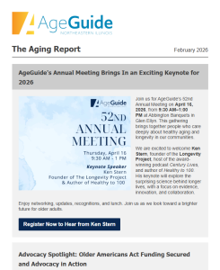 The Aging Report is a monthly publication that gives an overview on aging related topics, updates on AgeGuide initiatives and advocacy, special events and more! Each month highlights a different topic and funded partner of AgeGuide.